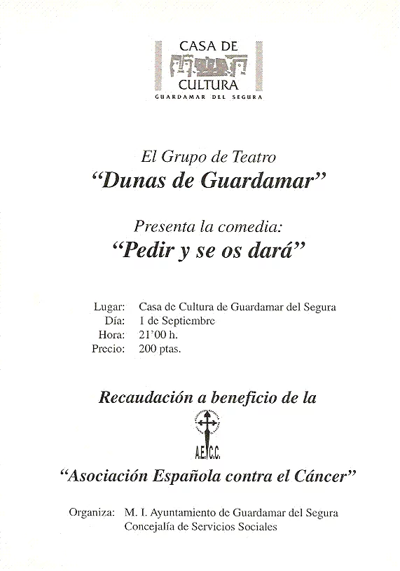 Aquí mostramos el reparto original de actores y actrices, y que dieron lugar a la primera representación y puesta en escena de la obra de teatro "Pedir y se os dará". En el día de su estreno, del 1 de Septiembre del año 1.996 . |